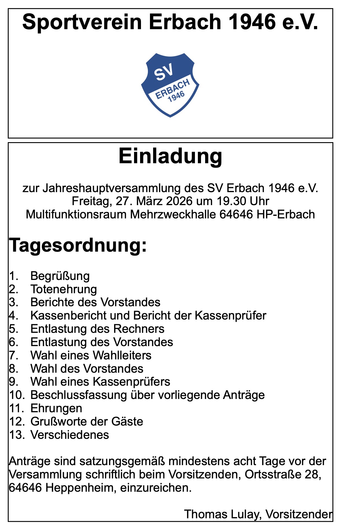 Euer Vorstand des Sportverein Erbach 1946 e.V.